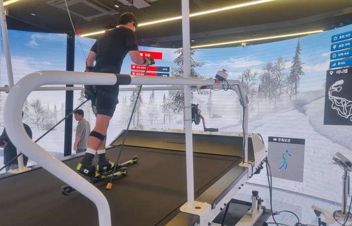 Trackmaster XR은 360도 서라운드 디스플레이와 대형 트레드밀을 결합한 프로 선수용 VR 크로스컨트리 스키 트레이닝 시스템입니다. 실제 설원 지형을 그대로 구현하여 몰입감 높은 환경에서 체력과 기술을 동시에 훈련할 수 있습니다.